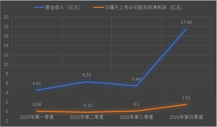 到了第四季度,公司功绩俄顷爆发——单季实现营业收入约17.48亿元,2024年同期约为8.4亿元;归母净利润约1.51亿元,不仅顺利扭转了2024年同期亏本约1.01亿元的劣势,更孝敬了全年98%的净利润。