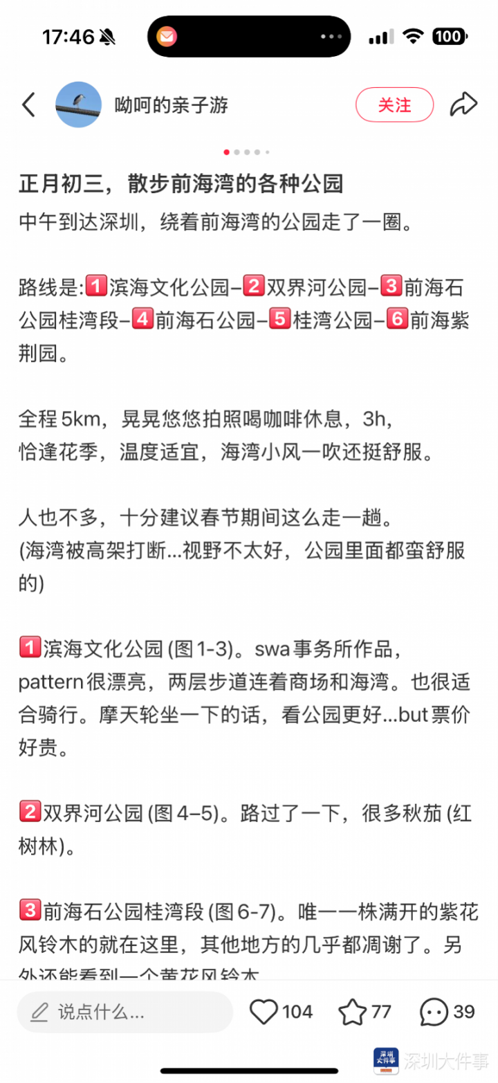 “恰逢花季,海湾小风一吹挺怡然……”网友在外交平台上共享了我方的一日纪行。在她的镜头下,一条长达5公里的前海湾“公园群落”被勾画出来:从滨海文化公园起步,双层步谈完满和会了繁荣商圈与静谧海湾,岂论是逆风骑行如故登顶摩天轮,皆是绝佳的不雅景体验;沿海而行,双界河公园里连片的红树林筑起期许盎然的生态樊篱;踱步至前海石公园桂湾段,恰逢满树的紫花风铃木与黄花风铃木迎春盛放,成为一齐最惊艳的“生态打卡位”;一齐向南,阶梯延迟至前海石公园、桂湾公园与前海紫荆园……吹海风、看似锦、喝咖啡,这篇主打“哆哆嗦嗦”的微度假攻略,恰是多半搭客来前海“Citywalk过大年”的纯真缩影。