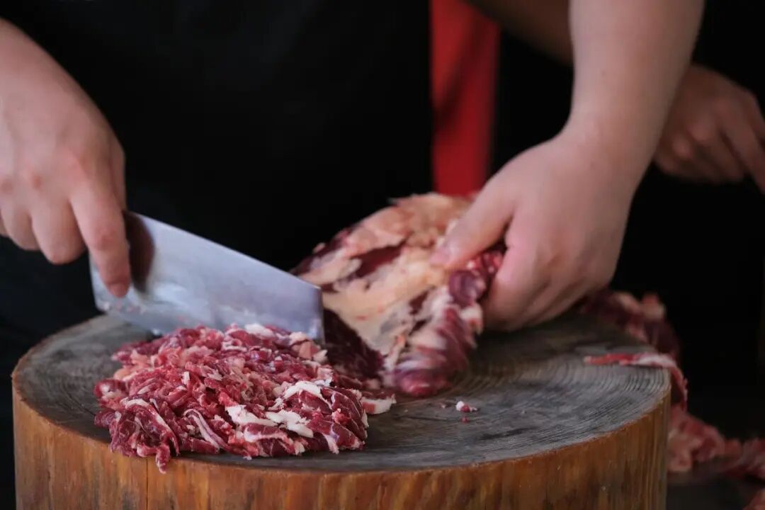 这份对鲜的执念,藏在从牧场到餐桌的每一个法子里。选肉上,潮汕东说念主有着近乎暴虐的标准,只选定本日现宰的适龄黄牛,全程远隔冷冻肉、注水肉,从宰杀到上桌严格铁心在4小时内,只为锁住牛肉最原生的鲜甜;刀工上,全靠淳厚傅手工逆纹切制,每一派肉都要作念到厚薄均匀、纹理赫然、薄可透光,只好这么,智商在滚汤中涮出最嫩弹的口感。