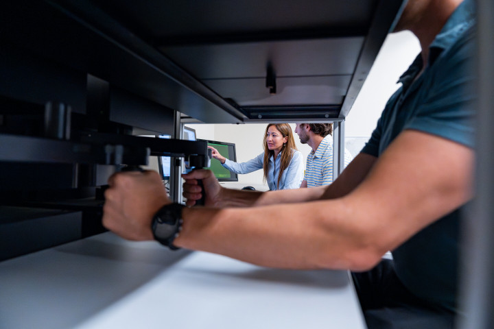 受试者伸手去够电脑屏幕上的处所,而阿拉·艾哈迈德和科林·科比什则在一旁不雅察数据。图片起首:杰西·摩根·彼得森/科罗拉多大学博尔德分校工程与欺诈科学学院