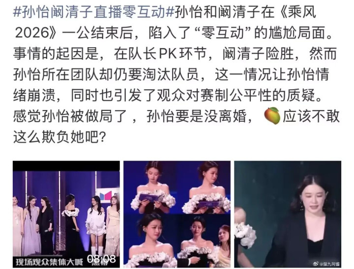 孙怡在后台也刻意的不看阚清子,而阚清子在孙怡附近晃悠了一圈念念说又不敢说的样貌让不少网友深嗜,合计孙怡在冷暴力她,不应该把节目组的脚本迁怒于她。阚清子当初决定来参预这个节目更多的即是念念要散心,走出失去男儿的悲悼中,成果因为节目组这样一整,她又驱动痛楚起来,还又吃上了抑郁的药。